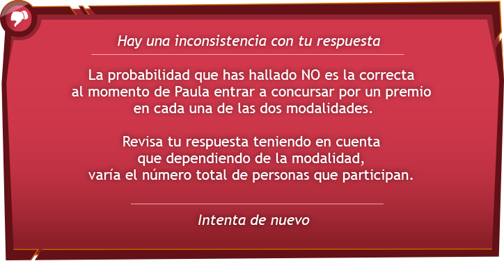 1. Halla la probabilidad de que Paula se gane un premio en cada una de las dos modalidades. Y selecciona la opción que represente la probabilidad que ella tiene de ganarse un premio.