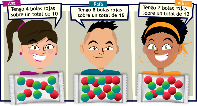 1. Ana, Rafa, y Alicia tienen en su bolsa una cantidad de bolas rojas y de otro color. Completa la tabla con la información y la probabilidad de sacar una bola roja para cada uno de ellos.